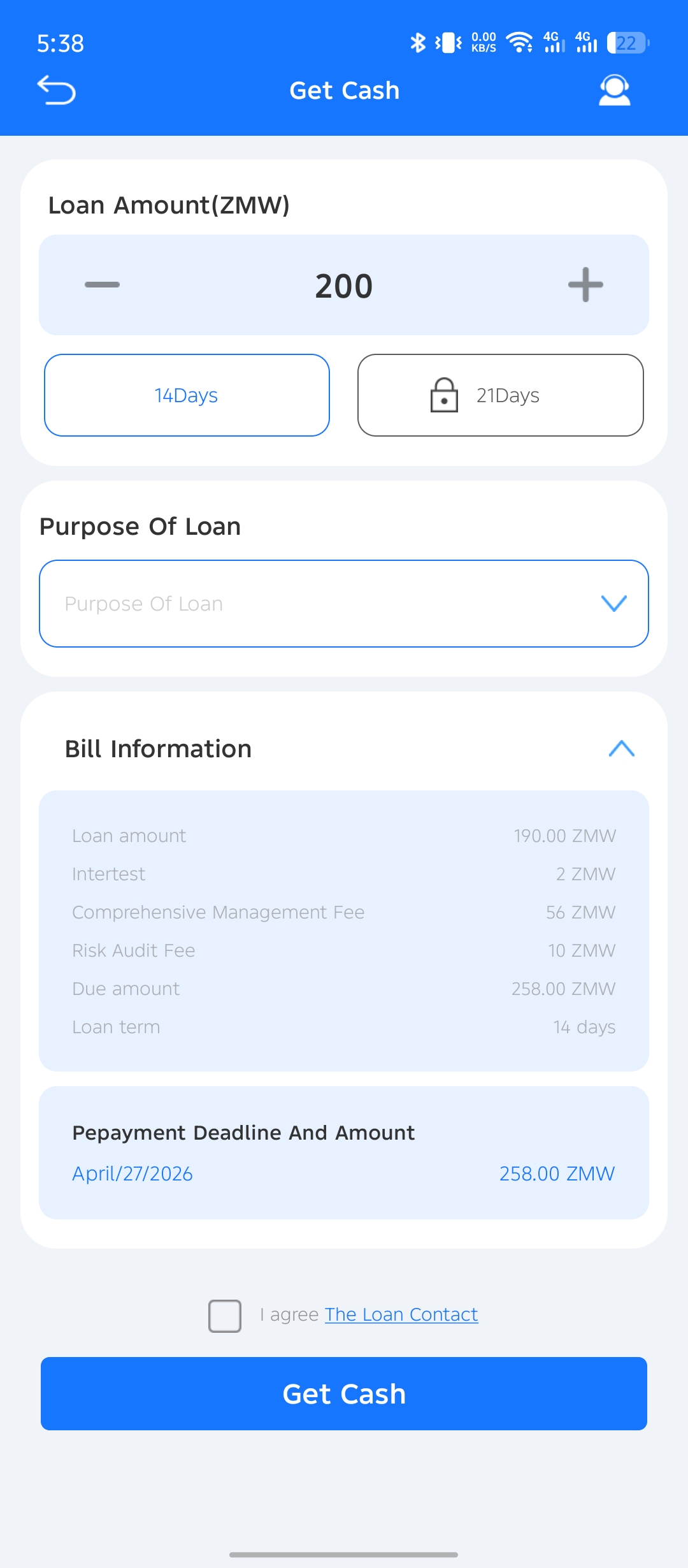 When you first use Zeed loan, you will be able to get K200 as your initial loan amount. You can choose between a term of 1 week or two weeks, which is 7 days or 14 days.
