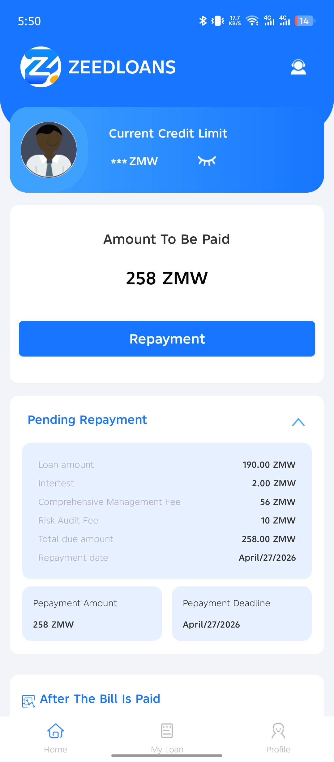The interest rate is billed at 1%, but this is misleading since there is also a service charge is K56 on a loan amount of K200. This means for your very first loan, you will have to pay back K258 in total. This means you will effectively pay back 25 percent more than the principal loan amount.