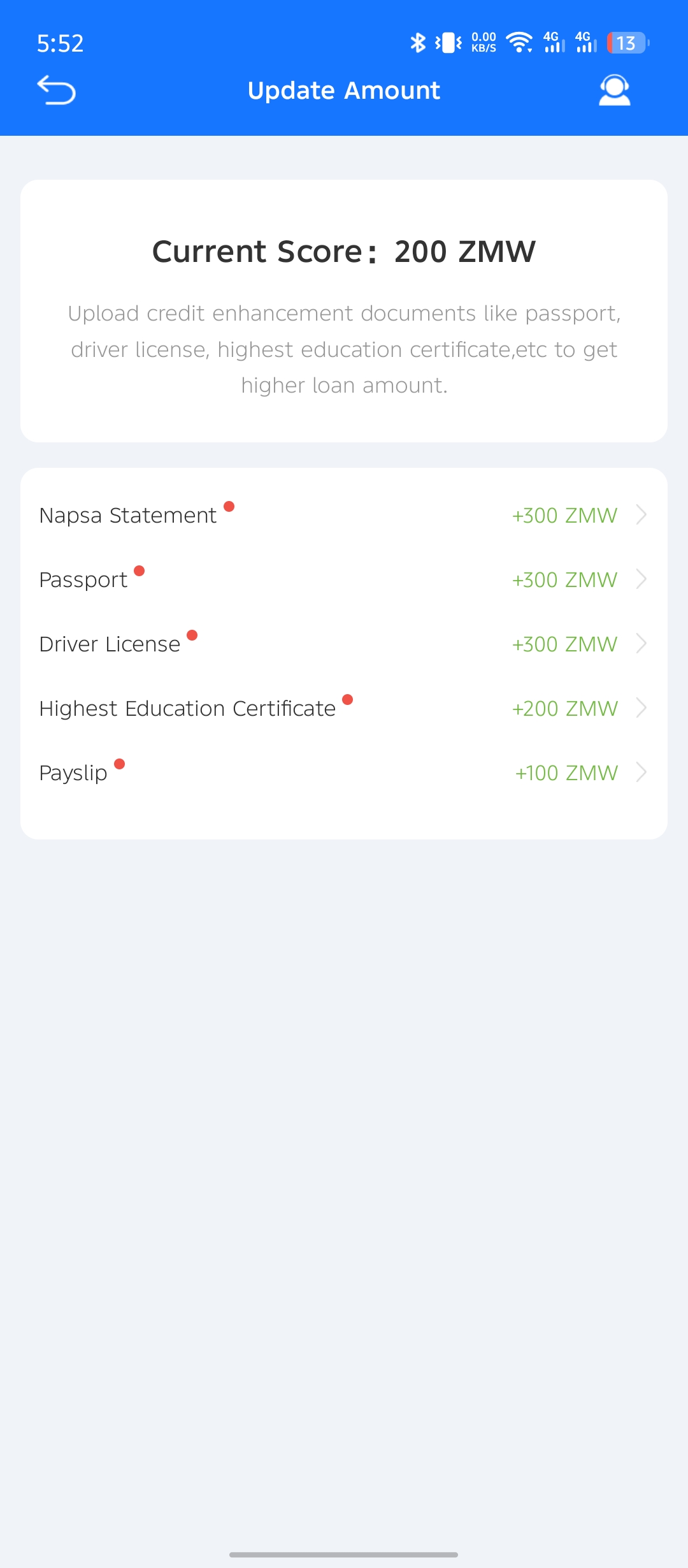 Please note: These are not necessary if you are getting yout first loan. Submotting these documents only serve the purpose of increasing your credit score, granting you access to high loan amount. In fact, you will not have access to this feature until your loan amount grows to thousands of Kwacha.